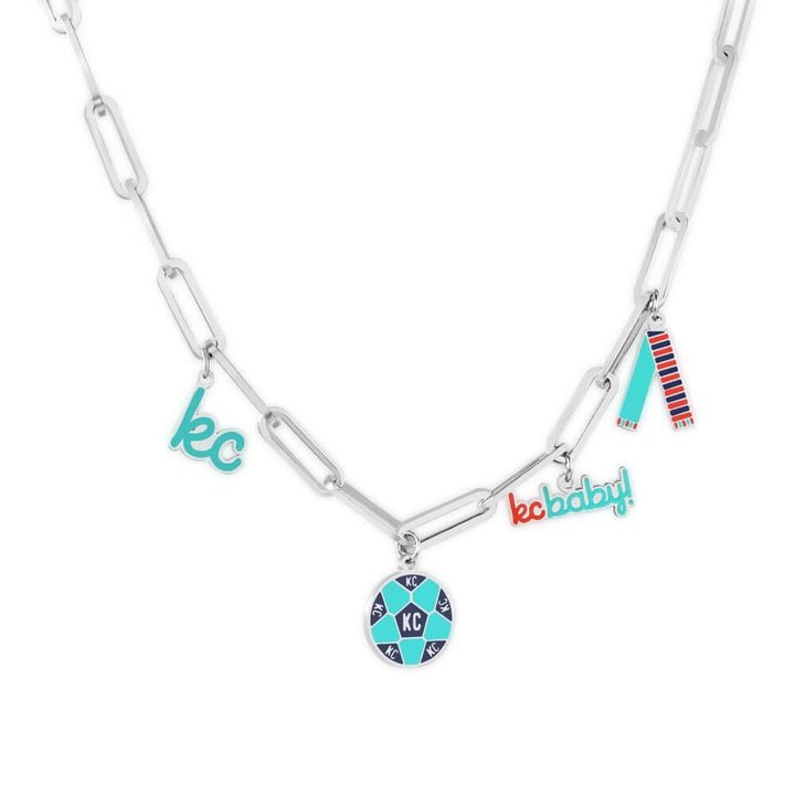 Add charm to your wardrobe with the Kansas City Charm Necklace - KC Baby. This cute and fun necklace features the iconic KC Current and KC Baby charms, representing the vibrant spirit and teal town pride of Kansas City. Show off your love for this city with this must-have accessory.