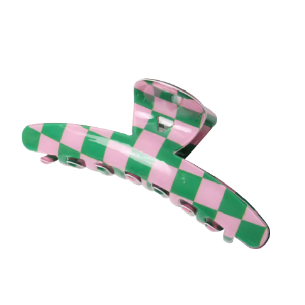 Get ready to bring back some 90s vibes with this Pink & Green Checkered Claw Clip! This cute and fun hair accessory is perfect for adding a playful touch to any hairstyle. Say goodbye to boring hair days and hello to some quirky flair!
